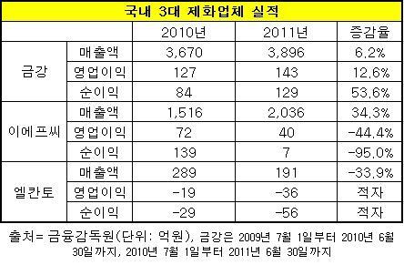 금강은 지난해 외형과 수익이 고루게 성장했지만 이에프씨(구 에스콰이어)와 엘칸토는 실적이 추락했다.