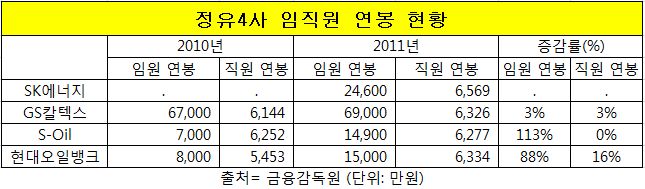 정유 4사의 지난해 직원 연봉은 SK에너지가, 임원 연봉은 GS칼텍스가 가장 높은 것으로 나타났다.