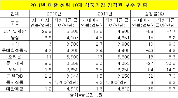 작년 매출액 기준 상위 10대 식품업체중 5개 기업은 사내이사 연봉이 훌쩍 뛰었고 7개기업은 직원 연봉이 급등했다.