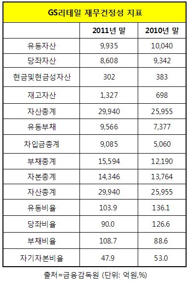 GS리테일의 유동자산은 2010년 말 1조40억원에서 지난해 말 9천935억원으로 줄었다. 반면 유동부채는 2010년 말 7천377억원에서 지난해 말 9천566억원으로 크게 불었다.