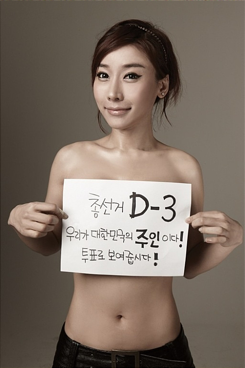 곽현화는 사진에서 상체를 벗고 투표 독려 메세지를 전했다. 그녀는‘총선거 D-3 우리가 대한민국의 주인이다! 투표로 보여줍시다!’라고 적힌 종이로 가슴을 가리고 서 있다.