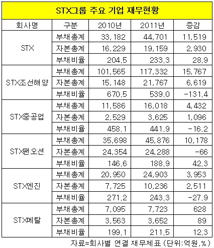 반면 그룹의 지주사인 STX와 주요 상장사인 STX팬오션, STX메탈은 지난해 부채가 큰 폭으로 늘어난 것에 비해 자기자본이 소폭 늘어나거나 감소하면서 부채비율이 높아졌다.
