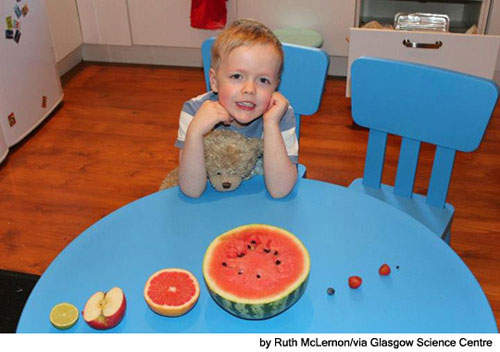 사진 속 어린 소년은'과일로 만든 태양계' 앞에서 자랑스러운 듯 표정을 짓고 있다.