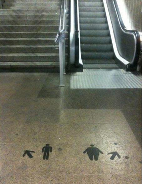 이 그림에는 계단을 올라가면 날씬한 사람, 에스컬레이터를 올라가면 뚱뚱한 사람이라는 재밌는 표시가 지나가는 사람에게 웃음을 준다.