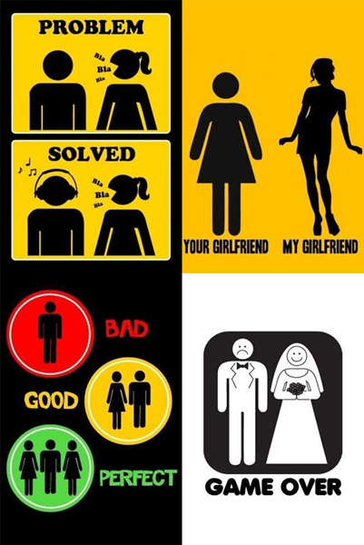 게시물에는 남자들은 여자친구가 잔소리를 할 때에는 듣지 않으면 그만이라는 뜻의 음악을 듣고 있는 그림이 그려져 있다.