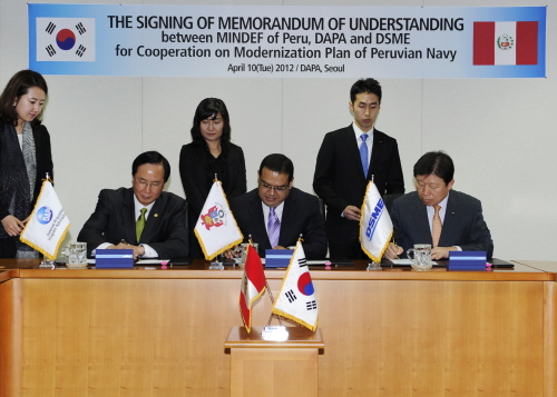 10일 대우조선해양은 고재호 사장이 이날 방위사업청사에서 오따롤라 페루 국방부장관, 노대래 방위사업청장과 함께 페루 해군함정 공동생산을 위한 협력 양해각서(MOU)를 체결했다고 밝혔다.