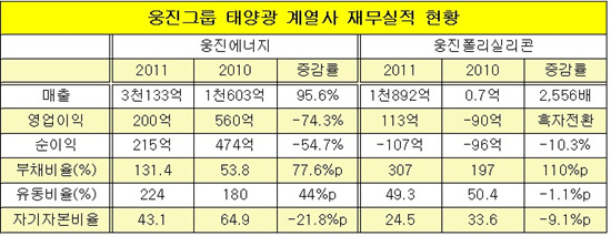 웅진그룹의 태양광 사업을 이끄는 웅진에너지는 작년 시황 악화와 매출원가 상승으로 영업이익과 순이익이 반토막 났다. 비상장 계열사인 웅진폴리실리콘은 설비투자를 위한 차입금이 늘어 영업이익이 턴어라운드 했음에도 순손실 폭은 더욱 커졌다.