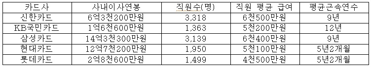 직원수는 신한카드가 3천318명으로 가장 많았다. 이어 삼성카드(2천976명), 현대카드(1천950명), 롯데카드(1천499명), 국민카드(1천363명) 순이었다.