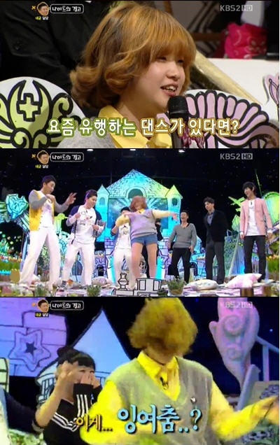 "최근 나이트에서 유행하는 춤을 보여달라"는 MC들의 요청에 그녀는 "셔플댄스가 지나고 요즘엔 잉여춤이 유행이다"라고 말한 뒤 춤을 선보였다.