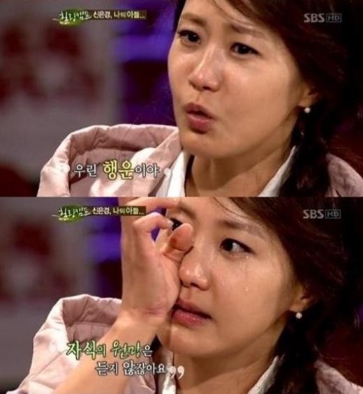 지난 9일 SBS '힐링캠프, 기쁘지 아니한가'에 출연한 신은경은 아들의 뇌수종 판정 후 힘들었던 심경을 털어놓으며 눈물을 감추지 못했다.