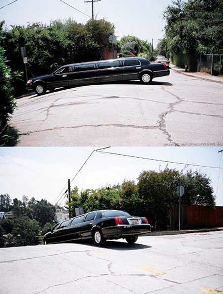 리무진의 치명적 단점 사진에서 한 리무진은 언덕길을 만나 고전하고 있다. 몸체가 길어 언덕을 타고 내려가는 것이 불가능한 것.