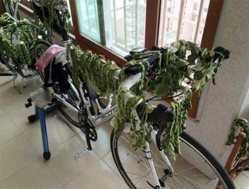 해당 사진 속에는 어느 아파트 베란다에 세워진 자전거에 무청으로 보이는 채소를 빼곡히 널어놓은 모습이 담겨있다.