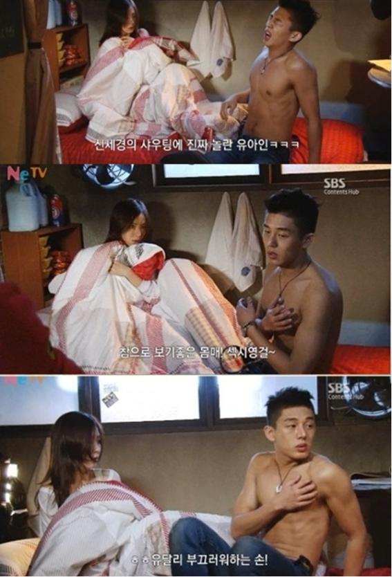 특히 유아인은 탄탄한 몸매에도 불구하고 촬영이 끝나자 부끄러워 하는 모습을 보였다. 그리고는 "옷 좀 주세요"라고 말하며 '부끄러운 손'을 연출해 웃음을 전했다. (사진-SBS)