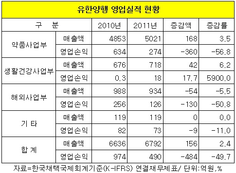 유한양행의 실적부진은 핵심 사업부인 약품부문의 영업실적이 큰 폭으로 떨어졌기 때문이다.