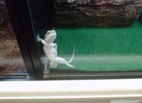 이 사진에는 흰색 도마뱀 한 마리가 한쪽 앞발을 벽에 짚고 나머지 앞발은 허리에 갖다 대 마치 '아가씨 지금 시간 있나?'라고 하는 듯한 포즈로 서 있다.