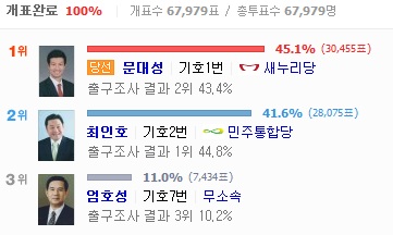 최종 투표율이 높은 가운데 문 후보가 논문 표절 의혹에도 불구, 19대 총선에서 승기를 잡았다.