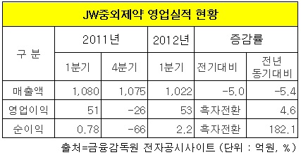 13일 금융감독원 공시자료에 따르면 JW중외제약은 올 1분기 매출액 1천22억원, 영업이익 53억원, 순이익 2억2천만원을 기록했다. 지난해 4분기 26억원의 영업손실과 66억원의 순손실을 냈지만 올해 흑자전환에 성공한 것.