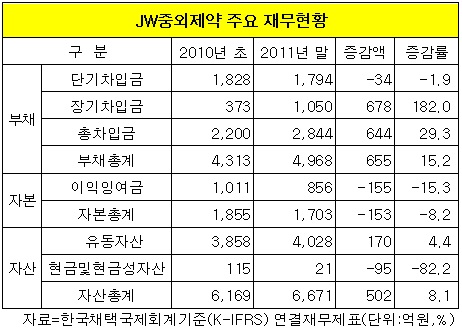 실적부진이 계속되면서 JW중외제약은 부채규모가 늘어나고, 주가하락까지 삼중고를 겪고 있다.