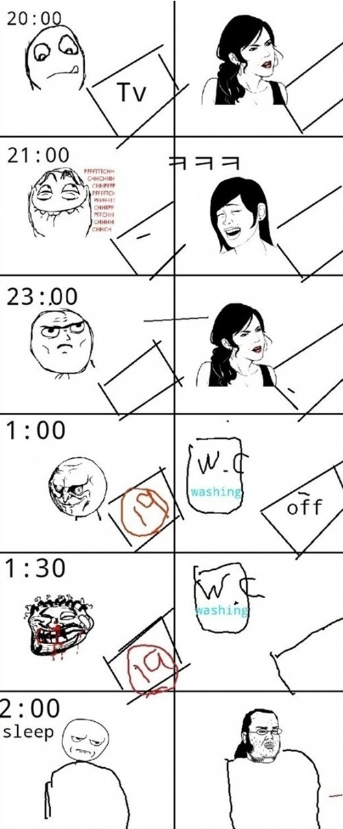 남자는 씻지도 않고 이불 속으로 들어가고, 깨끗하게 씻은 여자는 마치 아저씨와 같은 얼굴이 되어 있어 웃음을 준다.