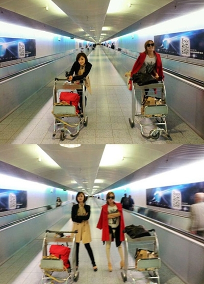 효민은 지난 11일 자신의 트위터에 “장보고 나오는 아줌마 포스로 세계에서 제일 큰 독일 프랑크프루트 공항을 마트로 만들어버린 둘”이라는 글과 함께 사진을 공개했다.