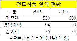 16일 금융감독원에 따르면 천호식품 부산 본사 지역의 지난해 매출액은 600억원으로 전년대비 13.2%나 증가했다. 영업이익과 순이익은 전년과 비슷한 93억원, 74억원을 기록했다.