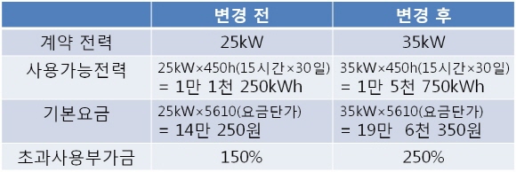 하지만 변경된 계산법을 적용하면 전력 피크(한 달 중 15분 이상 사용한 전력의 최고 치)가 계약전력을 초과할 경우 초과분에 대해 250%가 적용된다. 9kW에대한 요금이 기존보다 5만500원가량 더 많아진다.