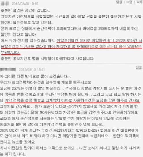 현재 포털 사이트와 온라인 커뮤니티 등에서는 한전의 최대수요전력 기준 초과사용부가금 제도 변경에 대해 “충분한 홍보기간이 없었고 홍보도 충분히 하지 않았다”, “피크를 실시간으로 확인할 수 없어 주의할 방안도 마련되지 않은 채 무작정 250%의 과금은 횡포다”, “계약 전력 이하로 사용할 시 요금 감면이 이루어지는 것도 아니면서 최대 사용량에 대한 요금만 250%나 부과하는 부당하다”는 논란이 계속되고 있다.