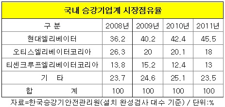 현재 국내 엘리베이터 시장은 오티스(미국), 티센크루프(독일), 쉰들러(스위스), 미쓰비시(일본), 코네(핀란드) 등 해외업체들과 토종 현대엘리베이터가 치열한 각축전을 벌이고 있다.