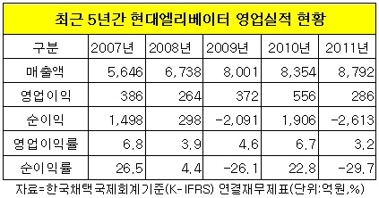 16일 관련업계에 따르면 현대엘리베이터는 지난해 영업이익률이 최근 5년이래 바닥을 쳤다. 2007년 6.8%, 2008년 3.9%, 2009년 4.6%, 2010년 6.7%에 이어 지난해 3.2%를 기록했기 때문.