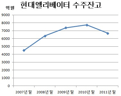 지난해 수주잔고 6천679억원은 전년(7천720억원)보다 13.5% 감소한 수준. 더욱이 현대엘리베이터 수주잔고가 6천억원대로 떨어진 것은 2008년(약 6천300억원) 이후 처음이다.