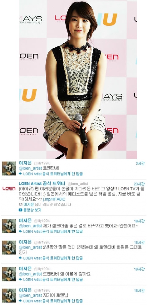 아이유는 14일 자신의 트위터를 통해 소속사 로엔엔터테인먼트가 준비한 로엔TV의 문제점을 디스(disrespect)했다.