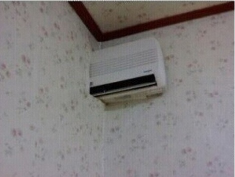 사진 속에는 민박집 벽에 달린 에어컨의 모습이 담겨있다. 그러나 보통의 에어컨 설치방법과는 다르게 벽을 뚫고 자리하고 있어 두 개의 방에서 동시 작동이 가능하게 설치돼 웃음을 자아낸다.