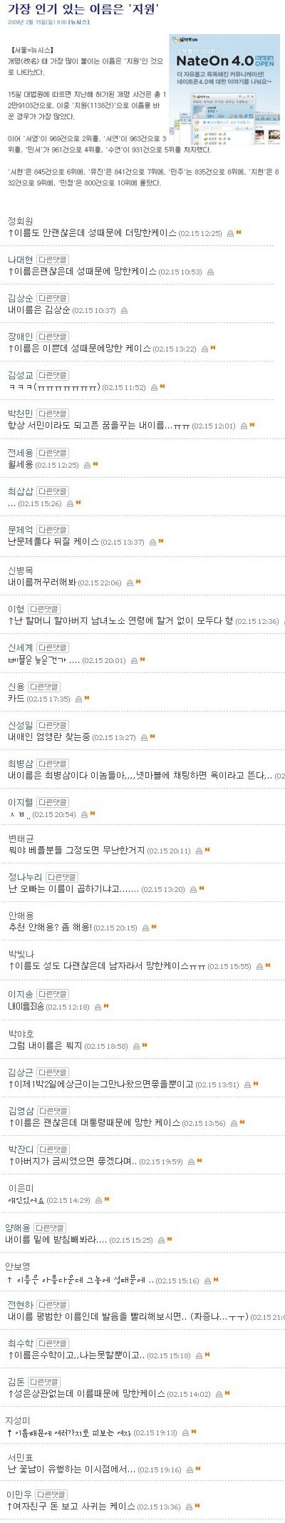 이는 언론매체에 공개된 가장 인기 있는 이름에 대한 반응을 캡처한 것으로 특이한 이름을 가진 사람들의 공감 댓글이 네티즌들의 웃음을 자아낸다.