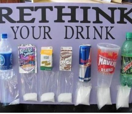 이 사진에는 미국인들이 즐겨 마시는 음료수 7가지와 그 밑에 그 음료수에 들어간 설탕의 양을 봉지에 넣어 알기 쉽게 표기했다.
