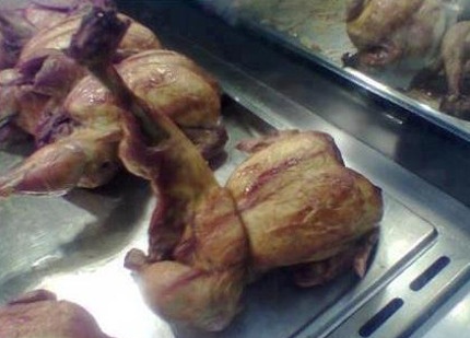 사진은 이미 익혀진 통닭 한 마리의 다리가 쭉 뻗어있는 모습이다.