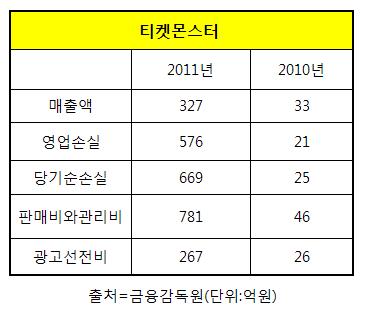 17일 금융감독원에 따르면 티켓몬스터는 지난해 영업손실 567억원, 당기순손실 669억원을 기록했다. 적자폭이 전년 대비 30배 가까이 확대됐다.
