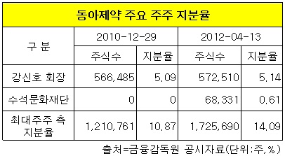 강 회장을 비롯한 동아제약 최대주주 측 지분율도 14.04%에서 14.09%로 0.05%p 높아졌다. 동아제약 최대주주 지분율이 지난 2010년 말 10.87%에 불과했던 것에 비하면 2년 3개월여만에 무려 3.22%p나 높아졌다.