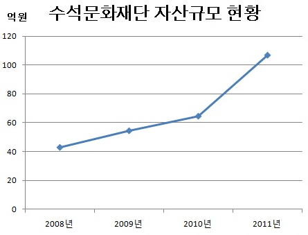 이 재단 관계자는 "지난해 말 총 자산규모는 107억원으로 2010년 말 64억원에서 40억원 가량이 증가했다"며 "보다 자세한 사항은 이달 내 결산보고서를 발표할 계획"이라고 말했다.