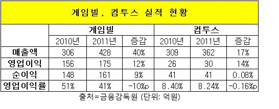 18일 금융감독원 공시자료에 따르면 게임빌과 컴투스의 지난해 매출은 각각 427억5천만원, 362억2천만원으로 전년대비 40%, 17% 증가했다.영업이익도 175억원, 30억원으로 전년대비 12%, 14% 늘어났다.