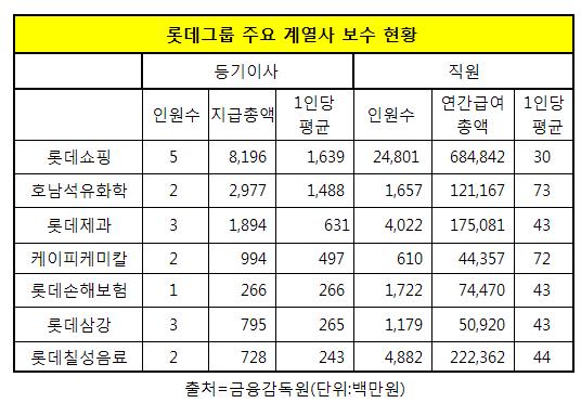 임원과 직원의 1인당 평균 지급액 차이는 롯데쇼핑이 16억원으로 무려 약 55배로 가장 컸고, 호남석유화학이 14억원으로 약 20배, 롯데제과가 6억원으로 약 14배의 차이를 보였다. 이외의 롯데삼강, 롯데손해보험 등은 약 6배의 격차에 그쳤다.