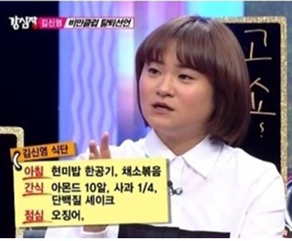 지난 17일 방송된 SBS ‘강심장’에 출연한 김신영은 자신의 다이어트 식단을 공개했다.