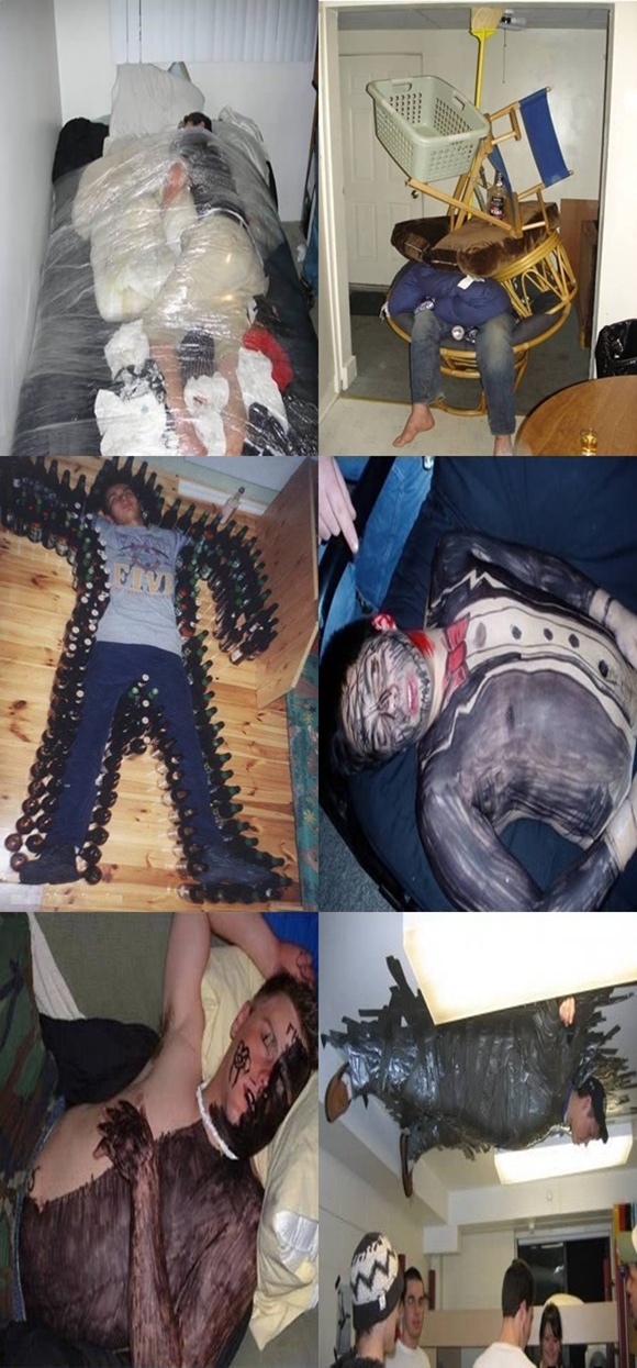 사진을 보면 잠든 친구의 몸에 낙서를 하거나 랩으로 온 몸을 싸 움직일 수 없도록 만들었다. 또 천장에 매달아 테이프로 감아놓기도 해 놀라움을 자아냈다.