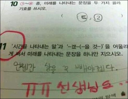 시험문제는‘시간을 나타내는 말과 -겠-(-을 것-)을 어울리게 써서 미래를 나타내는 문장을 하나만 지으시오’라는 문제로 답안에는‘언젠간 살을 꼭 빼야겠다’라고 적혀있다.