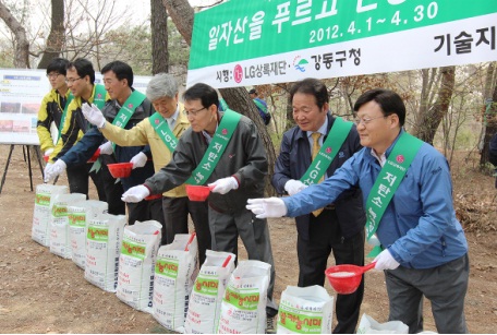 LG는 18일 서울 강동구 소재 일자산에서 ‘산림회복사업 행사’를 갖고 산성화가 심각한 일자산과 명일근린공원 등 총 40헥타아르(ha)에 이달 말까지 칼슘과 마그네슘이 포함된 토양개량제 124톤을 살포하기로 했다.