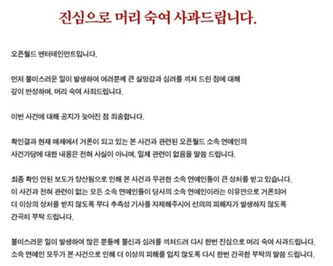 오픈월드 엔터테인먼트는 17일 공식 홈페이지에 “불미스러운 일이 발생해 여러분께 큰 실망감과 심려를 끼쳐 드린 점에 대해 깊이 반성하며 머리 숙여 사죄드린다”며 사과문을 게재했다.