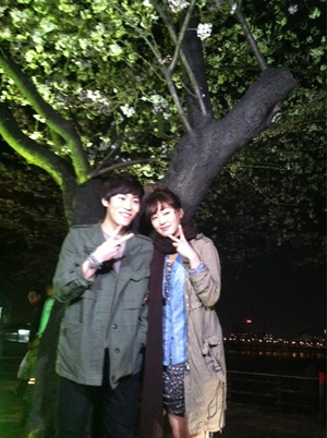 사진은 존박이 박진희와 함께 벚꽃 나무 아래에서 사진을 찍고 있는 모습이다.