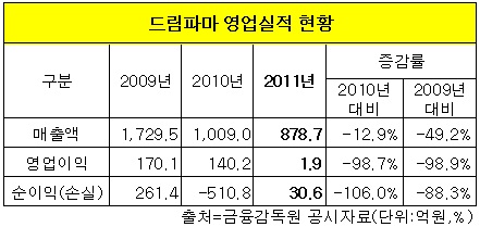 이에 따라 드림파마의 매출액은 2010년 1천억원대에서 지난해 870억원대로 감소했고, 영업이익도 140억원에서 1억8천500만원으로 쪼그라들었다. 순이익도 지난해 30억5천만원을 기록해 3년 전인 2009년(260억원)의 10분의 1수준에 머물렀다.