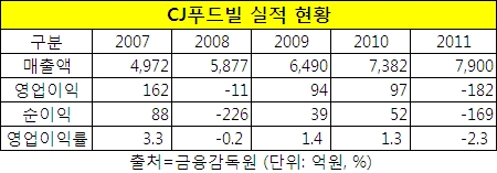 20일 금융감독원 공시자료에 따르면 CJ푸드빌의 작년 매출액은 7천900억원으로 전년대비 7% 소폭 증가했다. 반면 영업이익은 전년대비 무려 3배나 줄어들며 182억원 손실로 적자 전환됐다. 연결재무제표 기준으로는 매출 8천334억원, 영업이익은 223억원 적자다.