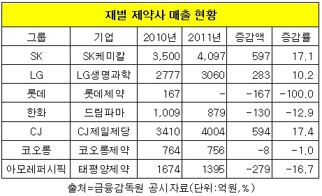 반면 코오롱제약(-1%), 한화그룹 계열의 드림파마(-12.9%), 태평양제약(16.7%)은 2010년보다 매출액이 되레 줄어들었다. 이들 재벌 제약사들의 매출이 이처럼 부진한 것은 지난해 리베이트 관련 정부의 감독이 강화되면서 전반적으로 영업환경이 위축됐기 때문.
