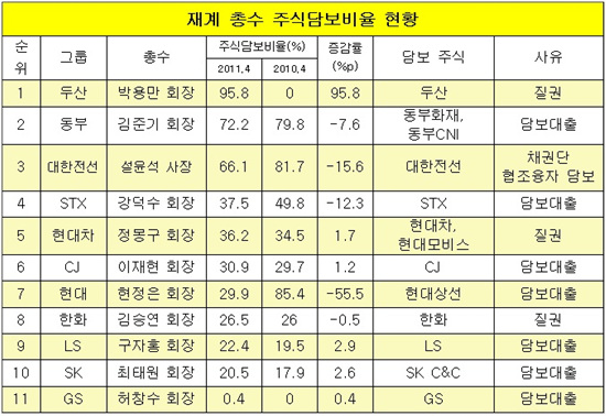 주식 담보비율이 가장 높은 총수는 두산 박용만 회장이었으며 동부 김준기 회장과 대한전선 설윤석 사장이 각각 72.2%와 66.1%로 뒤를 이었다.